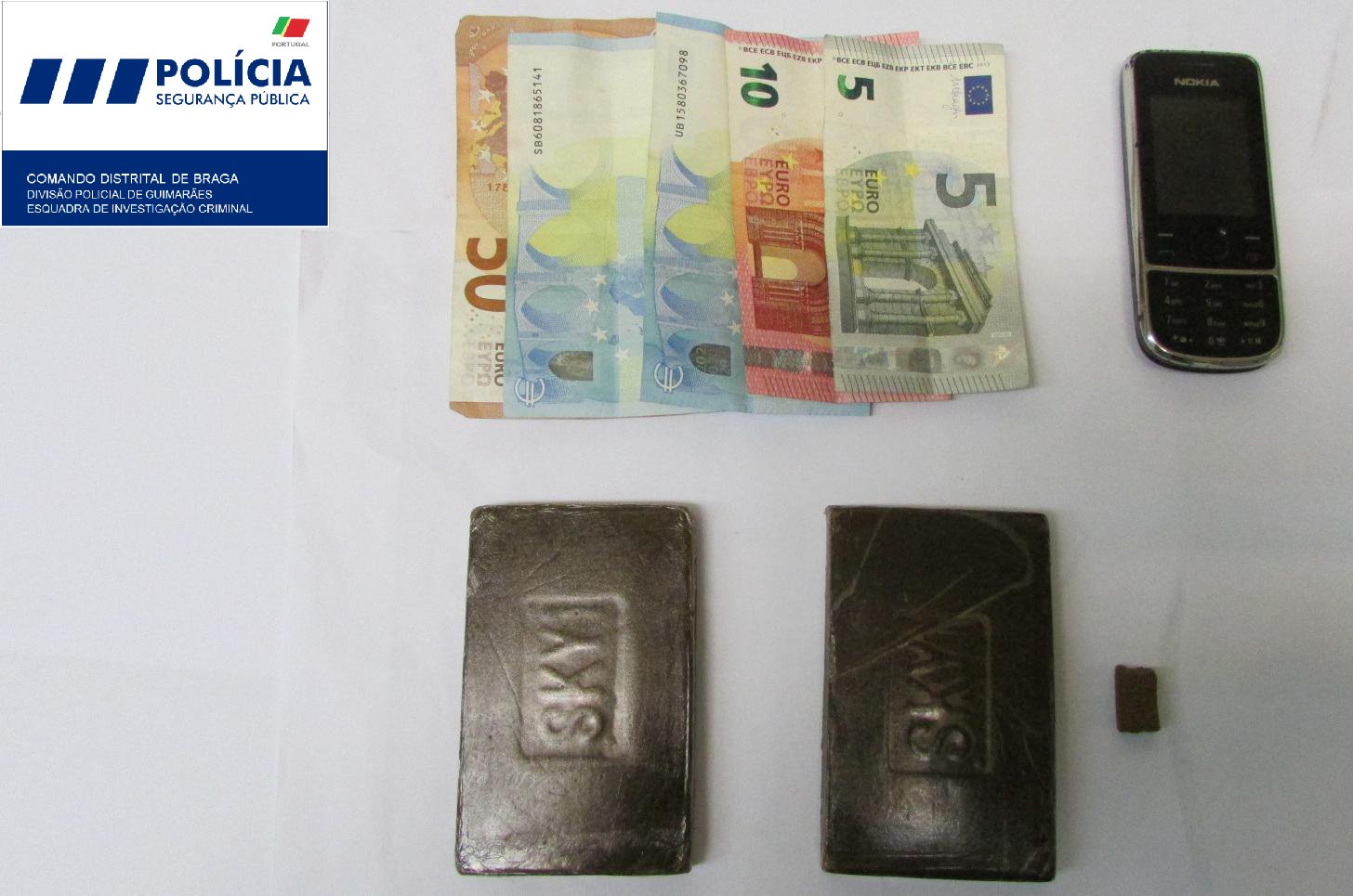 No decurso de uma operação policial, o cidadão foi interceptado na posse de haxixe suficiente para cerca de 400 doses, que lhe foram apreendidas, bem como a quantia de 105 euros em dinheiro e um telemóvel.